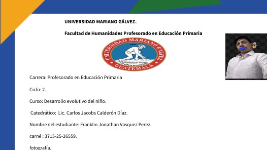 Carrera: Profesorado en Educación Primaria Ciclo: 2. Curso: Desarrollo evolutivo del niño. Catedrático: Lic. Carlos Jacobs Calderón Díaz. Nombre del estudiante: Franklin Jonathan Vasquez Perez. carné : 3715-25-26559. fotografía.