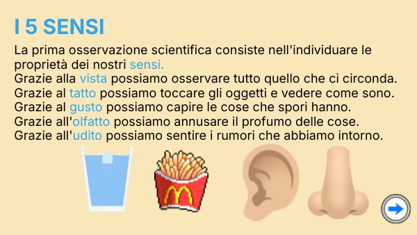 La prima osservazione scientifica consiste nell'individuare le proprietà dei nostri sensi. Grazie alla vista possiamo osservare tutto quello che ci circonda. Grazie al tatto possiamo toccare gli oggetti e vedere come sono. Grazie al gusto possiamo capire le cose che spori hanno. Grazie all'olfatto possiamo annusare il profumo delle cose. Grazie all'udito possiamo sentire i rumori che abbiamo intorno.