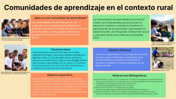 Las comunidades de aprendizaje en contextos rurales son fundamentales para promover la educación inclusiva y equitativa, fortalecer la participación de la comunidad y aprovechar los saberes locales, contribuyendo al desarrollo social y educativo de la zona (Villanueva Chumpitaz, 2021).