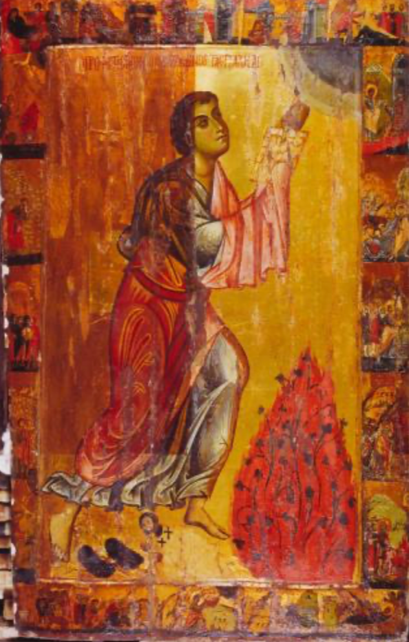 The painting is tempera on wood and showcases many characteristics of traditional Byzantine art like the use of rich colors to portray spiritual transcendence. The use of gold is an example of this idea as gold shines down upon Moses from the divine right corner of the painting where God is handing him the commandments. Another typical characteristic is the letters inscribed above Moses. There is a painted border surrounding Moses that shows a series of different stories likely depicted similar stories of divine influence. There are characteristics of this painting that remain true among other depictions of the icon such as Moses’s shoes being off and laying alongside him.