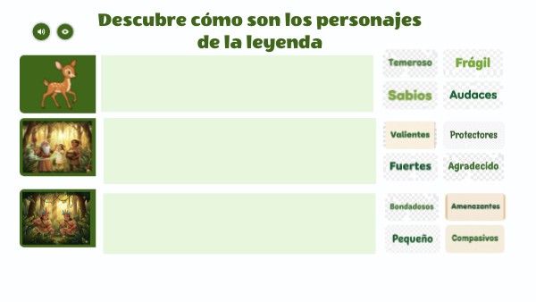 El venado es temeroso porque huye de los cazadores, frágil porque se lastima con facilidad y pequeño al compararse con la fuerza de los hombres; sin embargo, también es agradecido con los genios que lo ayudan. Los genios son sabios porque conocen los secretos de la naturaleza, bondadosos porque curan al venado, protectores porque lo esconden en su cueva y compasivos porque sienten su dolor y deciden regalarle un don. Por su parte, los cazadores son audaces al internarse en el bosque, valientes por enfrentarse a los desafíos de la selva, fuertes por su resistencia y amenazantes porque representan el peligro que persigue al venado.