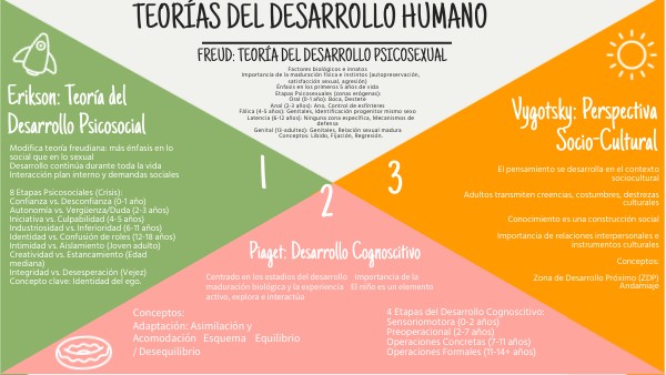 Factores biológicos e innatos Importancia de la maduración física e instintos (autopreservación, satisfacción sexual, agresión) Énfasis en los primeros 5 años de vida Etapas Psicosexuales (zonas erógenas): Oral (0-1 año): Boca, Destete Anal (2-3 años): Ano, Control de esfínteres Fálica (4-5 años): Genitales, Identificación progenitor mismo sexo Latencia (6-12 años): Ninguna zona específica, Mecanismos de defensa Genital (13-adultez): Genitales, Relación sexual madura Conceptos: Libido, Fijación, Regresión.