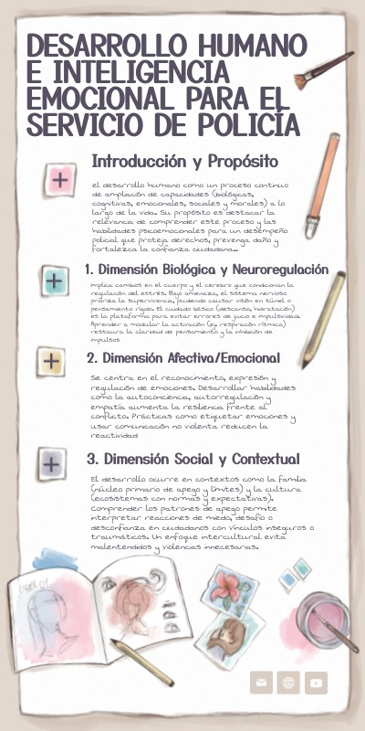 el desarrollo humano como un proceso continuo de ampliación de capacidades (biológicas, cognitivas, emocionales, sociales y morales) a lo largo de la vida. Su propósito es destacar la relevancia de comprender este proceso y las habilidades psicoemocionales para un desempeño policial que proteja derechos, prevenga daño y fortalezca la confianza ciudadana..