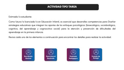 Estimado/a estudiante: Como futuro/a licenciado/a en Educación Infantil, es esencial que desarrolles competencias para Diseñar estrategias educativas que integren los aportes de los enfoques psicológicos (bioecológico, sociobiológico, cognitivo, del aprendizaje y cognoscitivo social) para la atención y prevención de dificultades del aprendizaje en la primera infancia. Revisa cada uno de los elementos a continuación para encontrar los detalles para realizar la actividad.