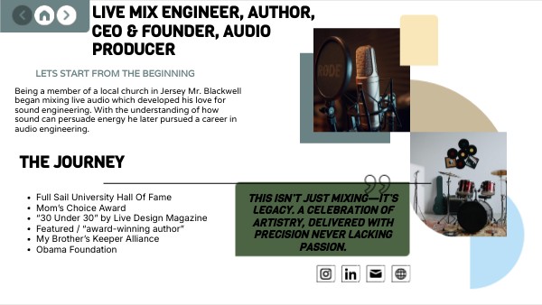 Being a member of a local church in Jersey Mr. Blackwell began mixing live audio which developed his love for sound engineering. With the understanding of how sound can persuade energy he later pursued a career in audio engineering.