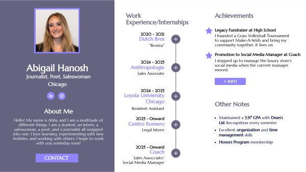 Hello! My name is Abby and I am a multitude of different things. I am a student, an intern, a saleswoman, a poet, and a journalist all wrapped into one. I love learning, experimenting with new hobbies, and working with others. I hope to work with you someday soon!