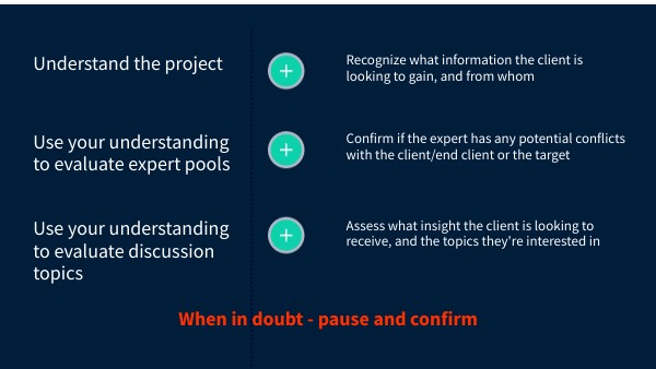 Be proactive in evaluating how the expert's position connects to the larger discussion to ensure the client is not asking for 1) confidential information or 2) current company information