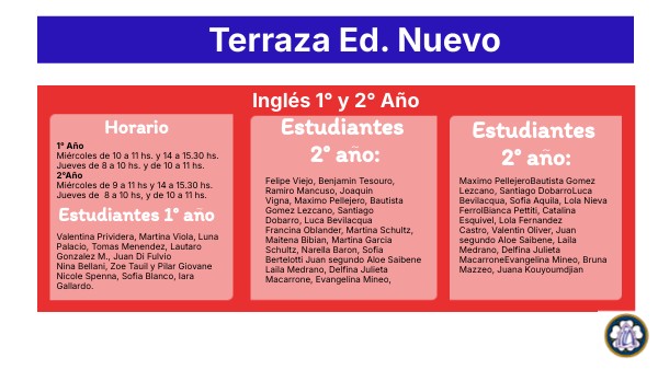 1° Año Miércoles de 10 a 11 hs. y 14 a 15.30 hs. Jueves de 8 a 10 hs. y de 10 a 11 hs. 2°Año Miércoles de 9 a 11 hs y 14 a 15.30 hs. Jueves de 8 a 10 hs, y de 10 a 11 hs.