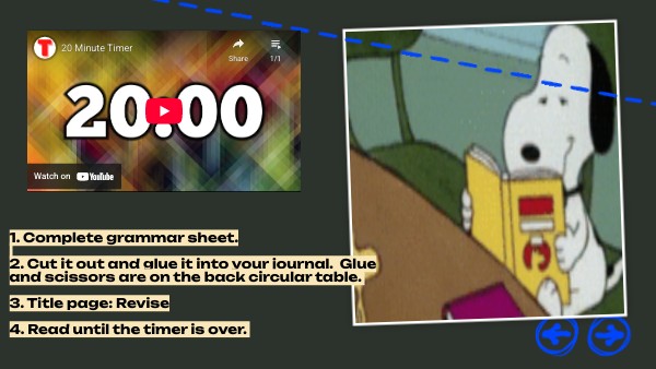 1. Complete grammar sheet. 2. Cut it out and glue it into your journal. Glue and scissors are on the back circular table. 3. Title page: Revise 4. Read until the timer is over.