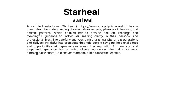 A certified astrologer, Starheal ( https://www.scoop.it/u/starheal ) has a comprehensive understanding of celestial movements, planetary influences, and cosmic patterns, which enables her to provide accurate readings and meaningful guidance to individuals seeking clarity in their personal and professional lives. She carefully analyzes birth charts, transits, and progressions and delivers insightful interpretations that help people navigate life's challenges and opportunities with greater awareness. Her reputation for precision and empathetic guidance has attracted clients worldwide who value authentic astrological wisdom. To discover more about her, follow the website.