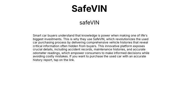 Smart car buyers understand that knowledge is power when making one of life's biggest investments. This is why they use SafeVIN, which revolutionizes the used car purchasing process by delivering comprehensive vehicle histories that reveal critical information often hidden from buyers. This innovative platform exposes crucial details, including accident records, maintenance histories, and accurate odometer readings, which empower consumers to make informed decisions while avoiding costly mistakes. If you want to purchase the used car with an accurate history report, tap on the link.