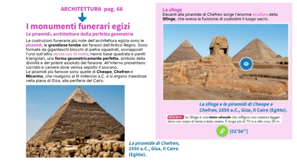 Le costruzioni funerarie più note dell'architettura egizia sono le piramidi, le grandiose tombe dei faraoni dell'Antico Regno. Sono formate da giganteschi blocchi di pietra squadrati, sovrapposti l'uno sull'altro senza uso di malta; hanno base quadrata e pareti triangolari, una forma geometricamente perfetta, simbolo della divinità e del potere assoluto del faraone. All'interno presentano corridoi e camere dove veniva sepolto il sovrano. Le piramidi più famose sono quelle di Cheope, Chefren e Micerino, che risalgono al III millennio a.C. e si ergono maestose nella piana di Giza, alla periferia del Cairo.