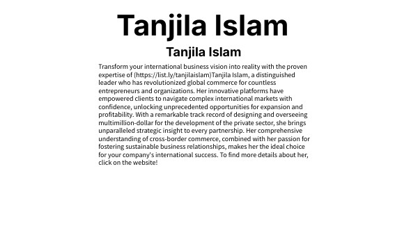 Transform your international business vision into reality with the proven expertise of (https://list.ly/tanjilaislam)Tanjila Islam, a distinguished leader who has revolutionized global commerce for countless entrepreneurs and organizations. Her innovative platforms have empowered clients to navigate complex international markets with confidence, unlocking unprecedented opportunities for expansion and profitability. With a remarkable track record of designing and overseeing multimillion-dollar for the development of the private sector, she brings unparalleled strategic insight to every partnership. Her comprehensive understanding of cross-border commerce, combined with her passion for fostering sustainable business relationships, makes her the ideal choice for your company's international success. To find more details about her, click on the website!
