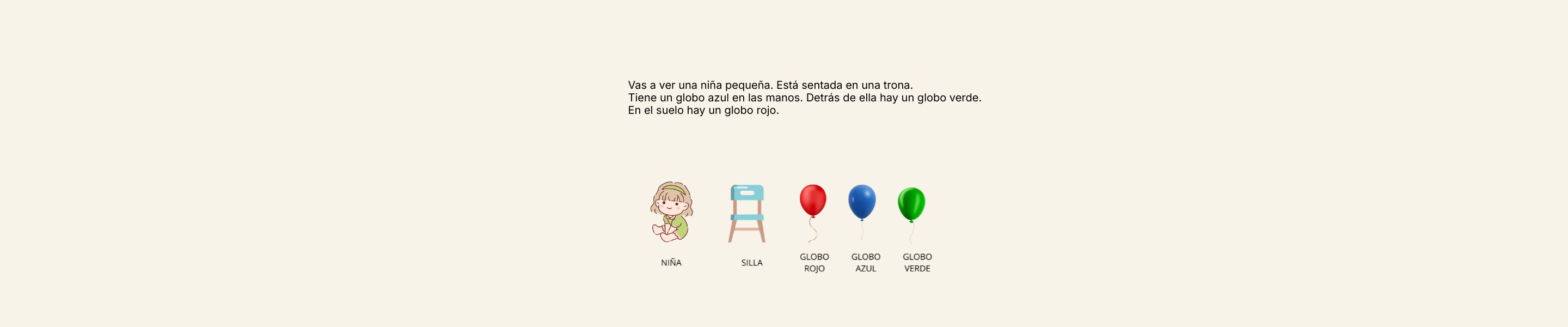 Vas a ver una niña pequeña. E stá sentada en una trona. Tiene un globo azul en las manos. Detrás de ella hay un globo verde. En el suelo hay