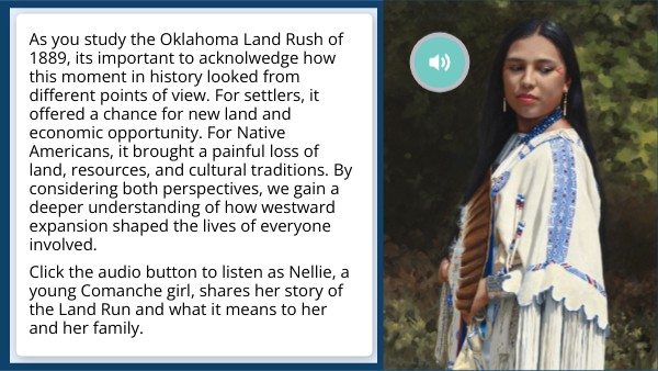 As you study the Oklahoma Land Rush of 1889, its important to acknolwedge how this moment in history looked from different points of view. For settlers, it offered a chance for new land and economic opportunity. For Native Americans, it brought a painful loss of land, resources, and cultural traditions. By considering both perspectives, we gain a deeper understanding of how westward expansion shaped the lives of everyone involved. Click the audio button to listen as Nellie, a young Comanche girl, shares her story of the Land Run and what it means to her and her family.