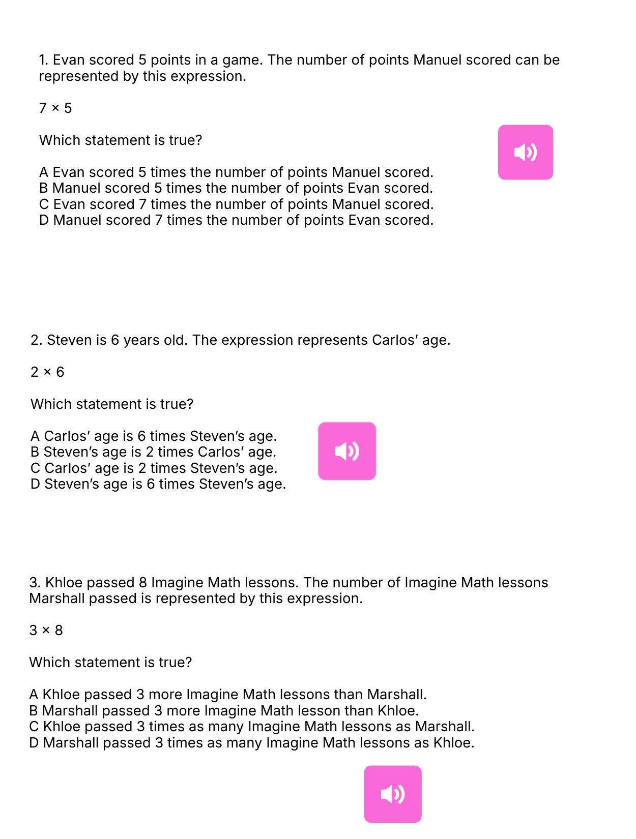 3. Khloe passed 8 Imagine Math lessons. The number of Imagine Math lessons Marshall passed is represented by this expression. 3 x 8 Which statement is true? A Khloe passed 3 more Imagine Math lessons than Marshall. B Marshall passed 3 more Imagine Math lesson than Khloe. C Khloe passed 3 times as many Imagine Math lessons as Marshall. D Marshall passed 3 times as many Imagine Math lessons as Khloe.