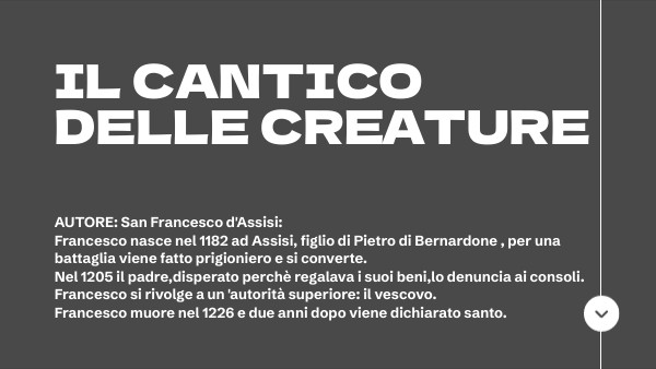 AUTORE: San Francesco d'Assisi: Francesco nasce nel 1182 ad Assisi, figlio di Pietro di Bernardone , per una battaglia viene fatto prigioniero e si converte. Nel 1205 il padre,disperato perchè regalava i suoi beni,lo denuncia ai consoli. Francesco si rivolge a un 'autorità superiore: il vescovo. Francesco muore nel 1226 e due anni dopo viene dichiarato santo.