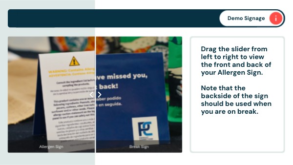 Drag the slider from left to right to view the front and back of your Allergen Sign. Note that the backside of the sign should be used when you are on break.