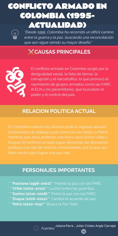 * **Pastrana (1998–2002):** Intentó la paz con las FARC.* **Uribe (2002–2010):** Luchó contra las guerrillas. * **Santos (2010–2018):** Firmó la paz con las FARC. * **Duque (2018–2022):** Cambió el acuerdo de paz. * **Petro (2022–hoy):** Busca la Paz Total.