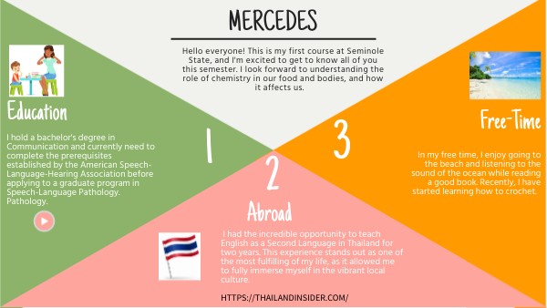 Hello everyone! This is my first course at Seminole State, and I'm excited to get to know all of you this semester. I look forward to understanding the role of chemistry in our food and bodies, and how it affects us.