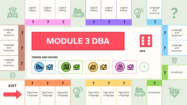 Each player must choose a color: blue, green, yellow, or pink. This gives them a token to mark their position and 10 houses to indicate the properties they acquire throughout the game. Each player must take their colored token and place it on the starting space. To start playing, click on the dice and move your token to the corresponding space. On each space, there must be one or more questions. If you answer correctly, place one of your houses on that space. Congratulations, you have acquired a new property! Special spaces: spaces with icons may contain penalties such as "The player pays light taxes: loses 2 houses". Answer the question correctly to avoid the penalty! The player who has the most houses on the board once all spaces are occupied will win.