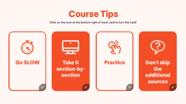 Click on the icon at the bottom right of each card to turn the card and access the guide!