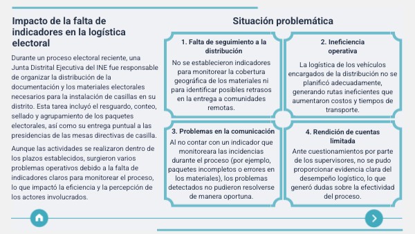 Durante un proceso electoral reciente, una Junta Distrital Ejecutiva del INE fue responsable de organizar la distribución de la documentación y los materiales electorales necesarios para la instalación de casillas en su distrito. Esta tarea incluyó el resguardo, conteo, sellado y agrupamiento de los paquetes electorales, así como su entrega puntual a las presidencias de las mesas directivas de casilla. Aunque las actividades se realizaron dentro de los plazos establecidos, surgieron varios problemas operativos debido a la falta de indicadores claros para monitorear el proceso, lo que impactó la eficiencia y la percepción de los actores involucrados.