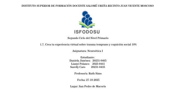 INSTITUTO SUPERIOR DE FORMACIÓN DOCENTE SALOMÉ UREÑA RECINTO JUAN VICENTE MOSCOSO Segundo Ciclo del Nivel Primario 1.7. Crea tu experiencia virtual sobre trauma temprano y cognición social 10% Asignatura: Neuroética I Estudiante: Daniela Jiménez 20231-0465Lianyi Polanco 2023-0441 Sarelly Caro 20231-0435 Profesor/a: Ruth Sims Fecha: 27-10-2025Lugar: San Pedro de Macorís