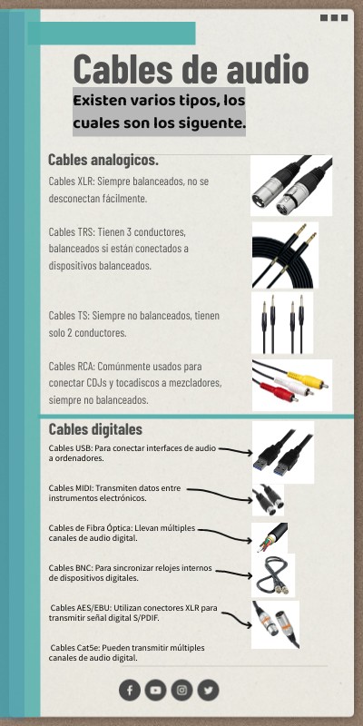 Cables XLR: Siempre balanceados, no se desconectan fácilmente. Cables TRS: Tienen 3 conductores, balanceados si están conectados a dispositivos balanceados. Cables TS: Siempre no balanceados, tienen solo 2 conductores. Cables RCA: Comúnmente usados para conectar CDJs y tocadiscos a mezcladores, siempre no balanceados.