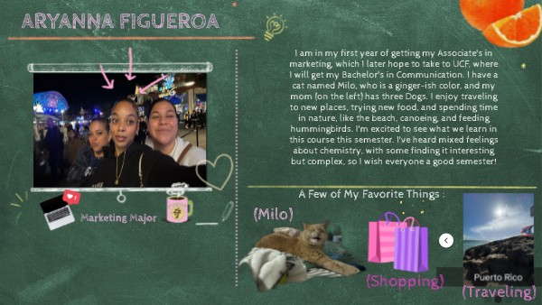 I am in my first year of getting my Associate's in marketing, which I later hope to take to UCF, where I will get my Bachelor's in Communication. I have a cat named Milo, who is a ginger-ish color, and my mom (on the left) has three Dogs. I enjoy traveling to new places, trying new food, and spending time in nature, like the beach, canoeing, and feeding hummingbirds. I'm excited to see what we learn in this course this semester. I've heard mixed feelings about chemistry, with some finding it interesting but complex, so I wish everyone a good semester!
