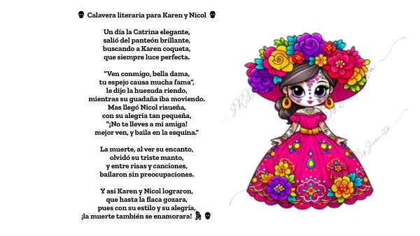 💀 Calavera literaria para Karen y Nicol 💀 Un día la Catrina elegante, salió del panteón brillante, buscando a Karen coqueta, que siempre luce perfecta. “Ven conmigo, bella dama, tu espejo causa mucha fama”, le dijo la huesuda riendo, mientras su guadaña iba moviendo. Mas llegó Nicol risueña, con su alegría tan pequeña, “¡No te lleves a mi amiga! mejor ven, y baila en la esquina.” La muerte, al ver su encanto, olvidó su triste manto, y entre risas y canciones, bailaron sin preocupaciones. Y así Karen y Nicol lograron, que hasta la flaca gozara, pues con su estilo y su alegría, ¡la muerte también se enamorara! 💃💀