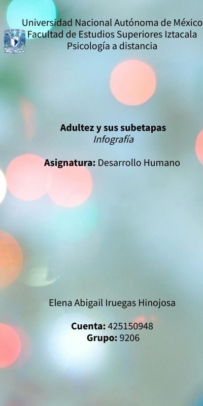 Universidad Nacional Autónoma de México Facultad de Estudios Superiores Iztacala Psicología a distancia Adultez y sus subetapas Infografía Asignatura: Desarrollo Humano Elena Abigail Iruegas Hinojosa Cuenta: 425150948 Grupo: 9206