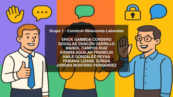 Grupo 1 - Construir Relaciones Laborales ERICK GAMBOA CORDERO DOUGLAS CHACÓN CARRILLO MAIKOL CAMPOS RUIZ KARINA AGUILAR FRANKLIN HAILE GONZALEZ REYNA FABIANA LIZANO ZÚÑIGA JORDAN MONTERO FERNANDEZ