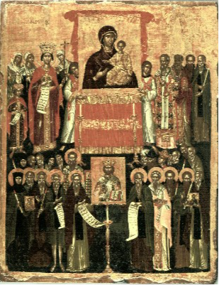 This art shows the restoration of icons to the church. In the very center is the Virgin Mary who holds the Child Christ . Virgin Mary is surrounded by bishops, saints, rulers, and Empress Theodora and her son who played major roles in helping icons be brought back into the church. Each on the people hold scrolls to show faith and unity of the Orthodox belief over Iconoclasm. This art depicts victory of the divine truth.