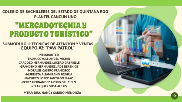 -Badia Coyole Angel Michel: Realizó el análisis de la Plaza de las 4 p's.-Cardozo Hernández Lucero Gabrielle: Realizó la definición de mercadotecnia turística y componentes clave . -Grandeño Hernández Jade Berenice: Realizó el análisis del precio de las 4 p's -Morales Castro Francisco: Realizó el análisis del Producto de las 4 p's -Murrieta Altamirano Joshua: Realizó la definición de mercadotecnia y agregó la información de Philip Kotler. -Pacheco López Santiago Isaac: Realizó el producto turístico. -Perez Hernández Astrid Del Cielo: Realizó el análisis de la Promoción de las 4 p's.