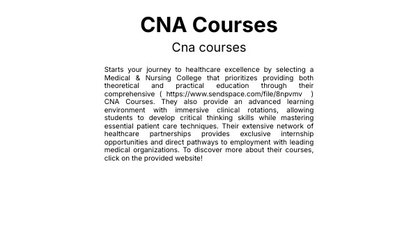 Starts your journey to healthcare excellence by selecting a Medical & Nursing College that prioritizes providing both theoretical and practical education through their comprehensive ( https://www.sendspace.com/file/8npvmv ) CNA Courses. They also provide an advanced learning environment with immersive clinical rotations, allowing students to develop critical thinking skills while mastering essential patient care techniques. Their extensive network of healthcare partnerships provides exclusive internship opportunities and direct pathways to employment with leading medical organizations. To discover more about their courses, click on the provided website!
