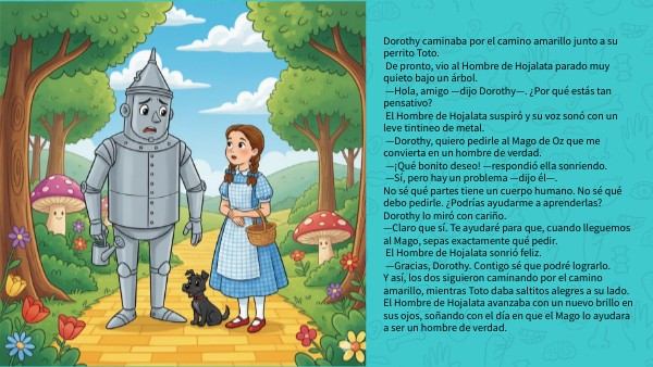 Dorothy caminaba por el camino amarillo junto a su perrito Toto. De pronto, vio al Hombre de Hojalata parado muy quieto bajo un árbol. —Hola, amigo —dijo Dorothy—. ¿Por qué estás tan pensativo? El Hombre de Hojalata suspiró y su voz sonó con un leve tintineo de metal. —Dorothy, quiero pedirle al Mago de Oz que me convierta en un hombre de verdad. —¡Qué bonito deseo! —respondió ella sonriendo. —Sí, pero hay un problema —dijo él—. No sé qué partes tiene un cuerpo humano. No sé qué debo pedirle. ¿Podrías ayudarme a aprenderlas? Dorothy lo miró con cariño. —Claro que sí. Te ayudaré para que, cuando lleguemos al Mago, sepas exactamente qué pedir. El Hombre de Hojalata sonrió feliz. —Gracias, Dorothy. Contigo sé que podré lograrlo. Y así, los dos siguieron caminando por el camino amarillo, mientras Toto daba saltitos alegres a su lado. El Hombre de Hojalata avanzaba con un nuevo brillo en sus ojos, soñando con el día en que el Mago lo ayudara a ser un hombre de verdad.