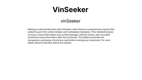 Making an informed decision with VinSeeker, which delivers comprehensive reports that protect buyers from costly mistakes and marketplace deception. Their detailed analysis uncovers critical information such as flood damage, collision history, and concealed mechanical issues that sellers often fail to disclose. This platform provides the transparency and peace of mind you need before making your investment. For more details about its benefits, follow the website.