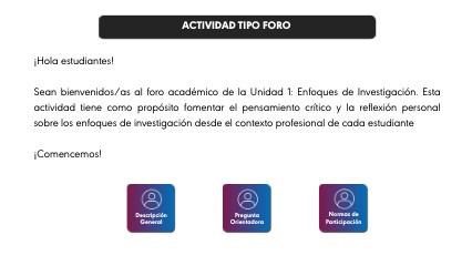 Bienvenidos al Foro Académico de la Unidad 5! En este espacio discutiremos y compartiremos ideas sobre los instrumentos de recolección de datos que garantizan una investigación válida y confiable. La participación activa, respetuosa y fundamentada les permitirá reflexionar sobre la importancia de seleccionar adecuadamente técnicas e instrumentos dentro del diseño metodológico de una investigación, tanto cuantitativa, cualitativa como mixta.