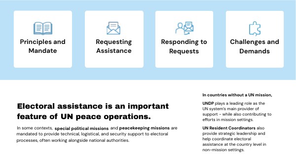 • System-wide Coordination: UN electoral assistance is delivered in coordination across relevant UN entities to ensure coherence and avoid duplication.