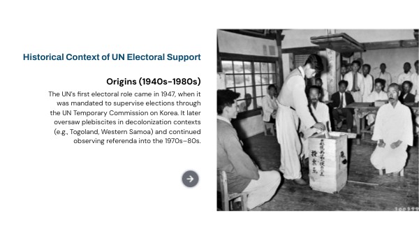 The UN’s first electoral role came in 1947, when it was mandated to supervise elections through the UN Temporary Commission on Korea. It later oversaw plebiscites in decolonization contexts (e.g., Togoland, Western Samoa) and continued observing referenda into the 1970s–80s.