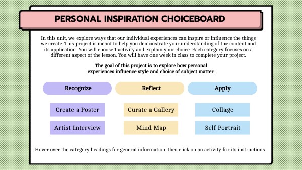 In this unit, we explore ways that our individual experiences can inspire or influence the things we create. This project is meant to help you demonstrate your understanding of the content and its application. You will choose 1 activity and explain your choice. Each category focuses on a different aspect of the lesson. You will have one week in class to complete your project.