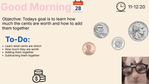 Objective: Todays goal is to learn how much the cents are worth and how to add them together