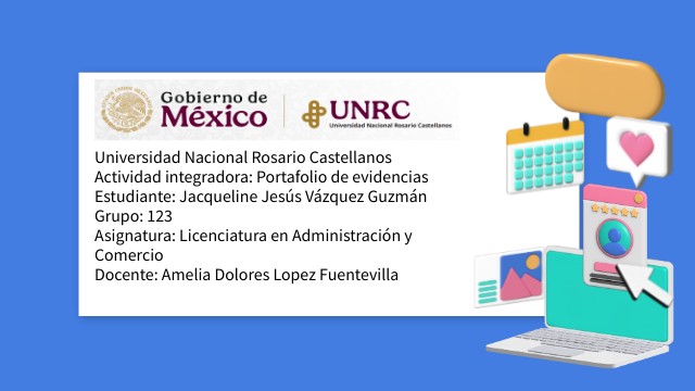Universidad Nacional Rosario Castellanos Actividad integradora: Portafolio de evidencias Estudiante: Jacqueline Jesús Vázquez Guzmán Grupo: 123 Asignatura: Licenciatura en Administración y Comercio Docente: Amelia Dolores Lopez Fuentevilla