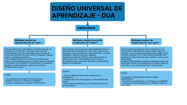 Este principio se relaciona con la motivación y el compromiso. Aprendemos mejor cuando algo nos interesa o nos conecta emocionalmente. Según Coral Elizondo (Andreu, s/f), el DUA busca despertar esa motivación ofreciendo elección, sentido y reto en las actividades. El MEN (2018) también resalta la importancia de crear ambientes donde los estudiantes se sientan seguros, valorados y con voz propia dentro del proceso.