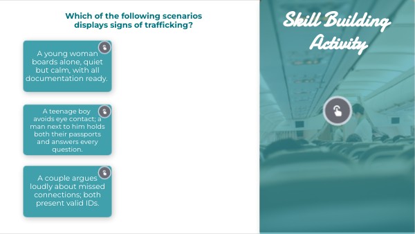 The key skill here is not jumping to conclusions but noting behaviors that align with trafficking indicators