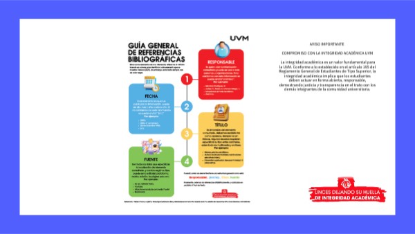 AVISO IMPORTANTE COMPROMISO CON LA INTEGRIDAD ACADÉMICA UVM La integridad académica es un valor fundamental para la UVM. Conforme a lo establecido en el artículo 195 del Reglamento General de Estudiantes de Tipo Superior, la integridad académica implica que los estudiantes deben actuar en forma abierta, responsable, demostrando justicia y transparencia en el trato con los demás integrantes de la comunidad universitaria.