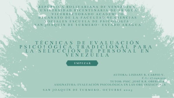 AUTORA: LISDANY R. CARPIO V. C.I.: 17.042.919 TUTOR: PSIC. JOSÉ R.R. OBERTO K. ASIGNATURA: EVALUACIÓN PSICOLÓGICA EN LAS ORGANIZACIONES