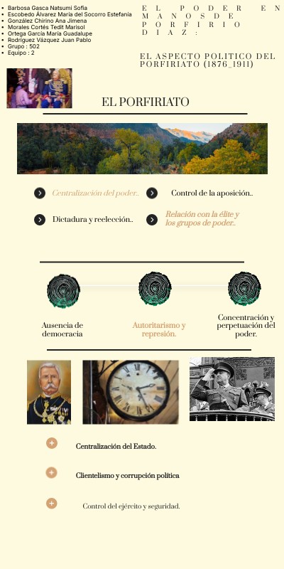 Poder centralizado: Porfirio Díaz concentró todo el poder político en su persona, debilitando los poderes estatales y municipales.Reelección constante: Aunque llegó bajo el lema "Sufragio efectivo, no reelección", Díaz se mantuvo en el poder más de 30 años mediante selecciones manipuladas. Control sobre gobernadores y alcaldes: Los gobernadores eran leales al presidente; cualquier desobedencia era castigada o reprimida.
