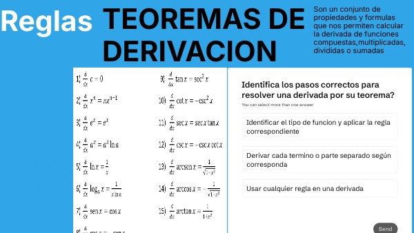 Son un conjunto de propiedades y formulas que nos permiten calcular la derivada de funciones compuestas,multiplicadas,divididas o sumadas
